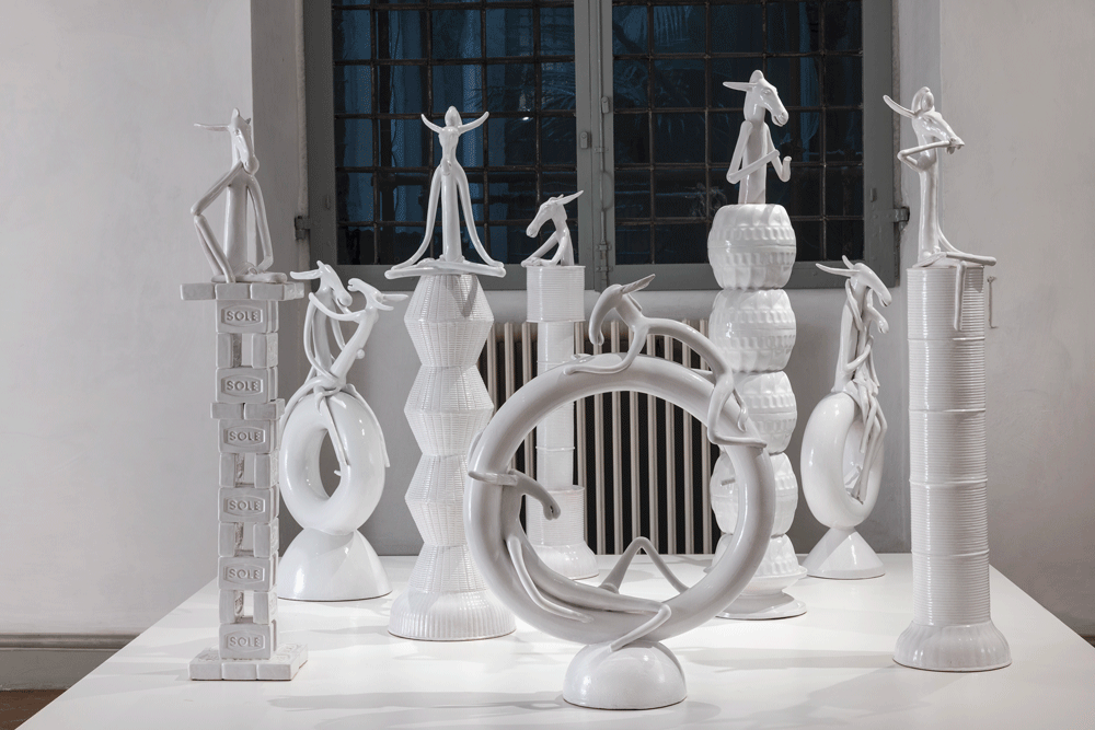 In questa nuova mostra Paolo Maione presenta un nuovo ciclo di maioliche e sculture in bronzo in cui il ciuco, elemento che da sempre è riferimento iconografico dell’artista, prosegue il suo viaggio, in un continuo gioco di umoristiche metamorfosi, ironiche ascesi e allucinate citazioni. Questa figura simbolo è l’antieroe per eccellenza, rappresentato in diverse pose e situazioni nelle quali giochi di parole e non sense contribuiscono a comporre i titoli delle opere stesse.