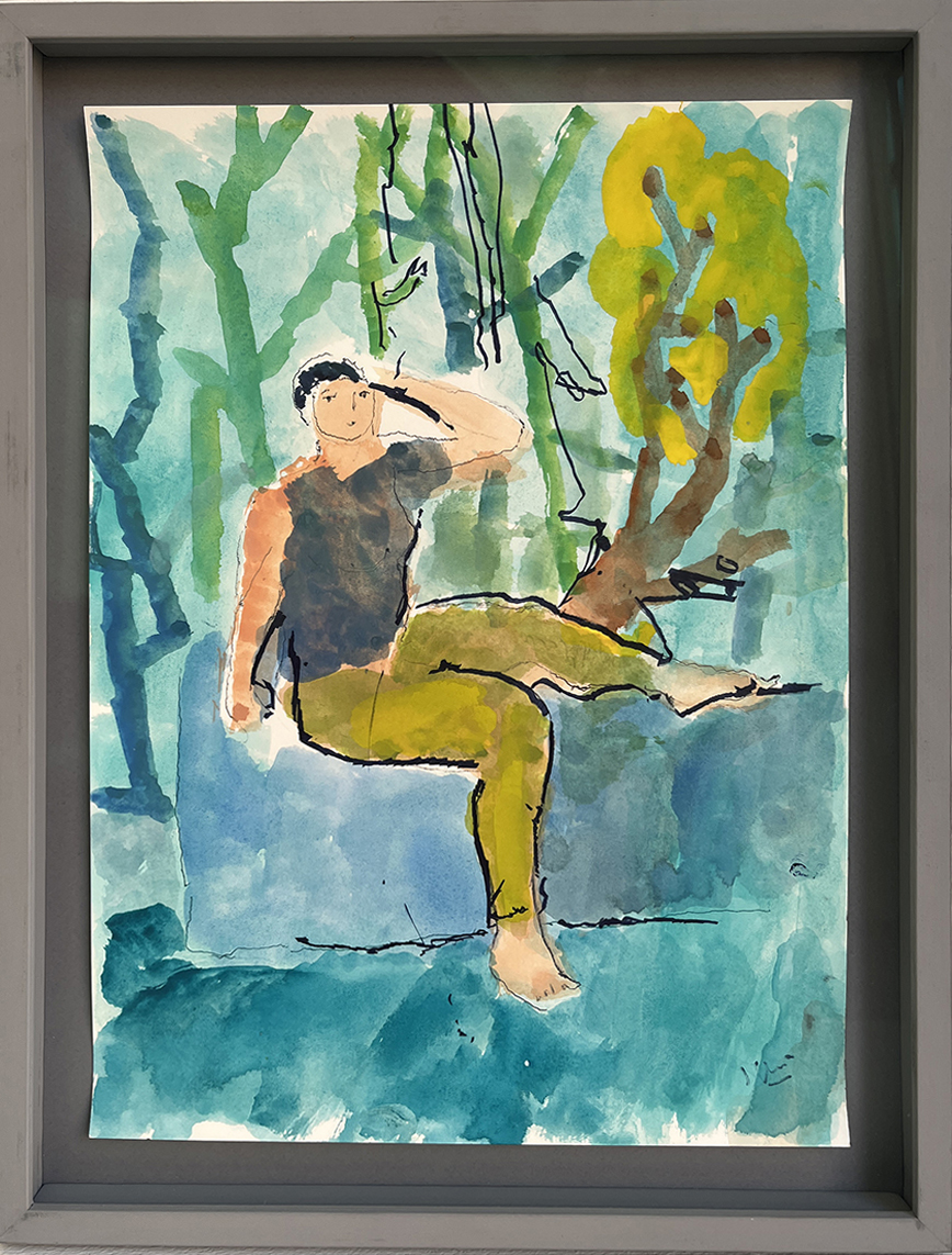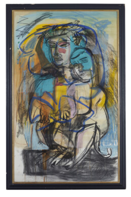 Scena d’aprile, 1991, Carboncino, pastello e acquerello su carta applicata su tela, 198 x 122 cm